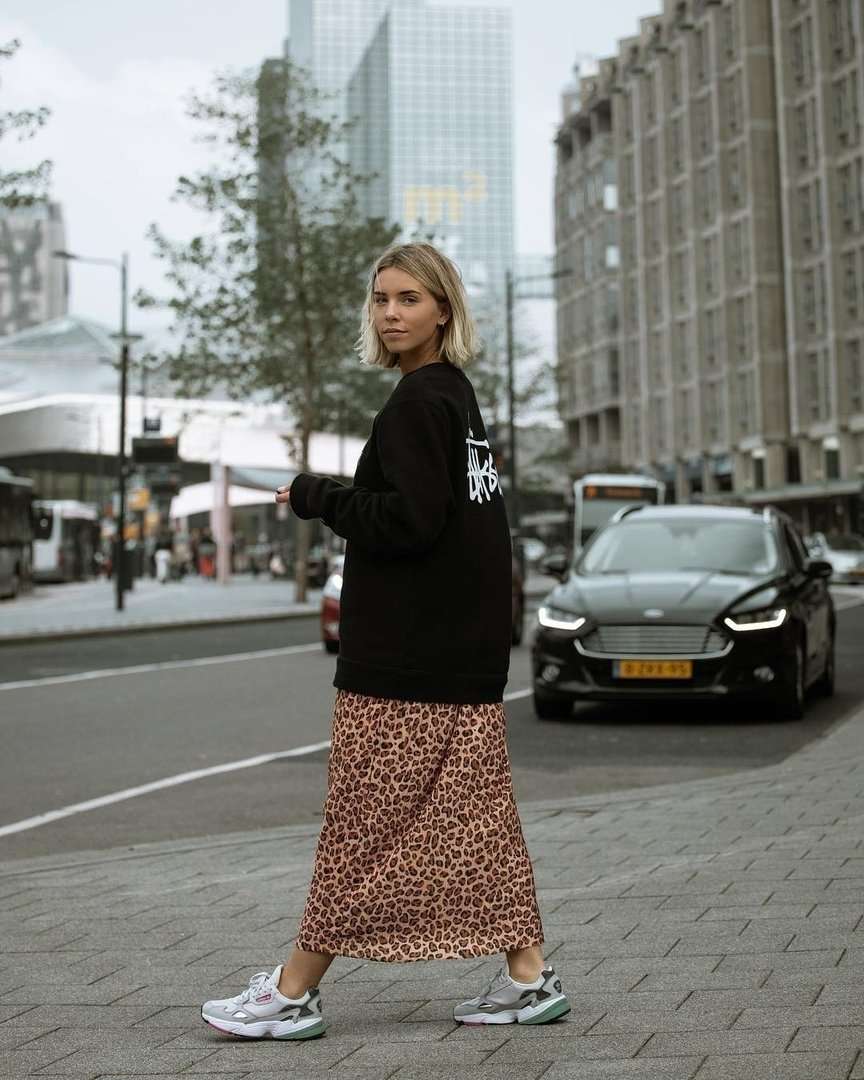 Kokomusta asu toimii aina! @stefneyv valitsee mustat Falconit värikkäillä yksityiskohdilla. @esmeetrouw asu on myös 5/5! Kuka sanoi, ettei sneakereita voisi käyttää hameen kanssa?