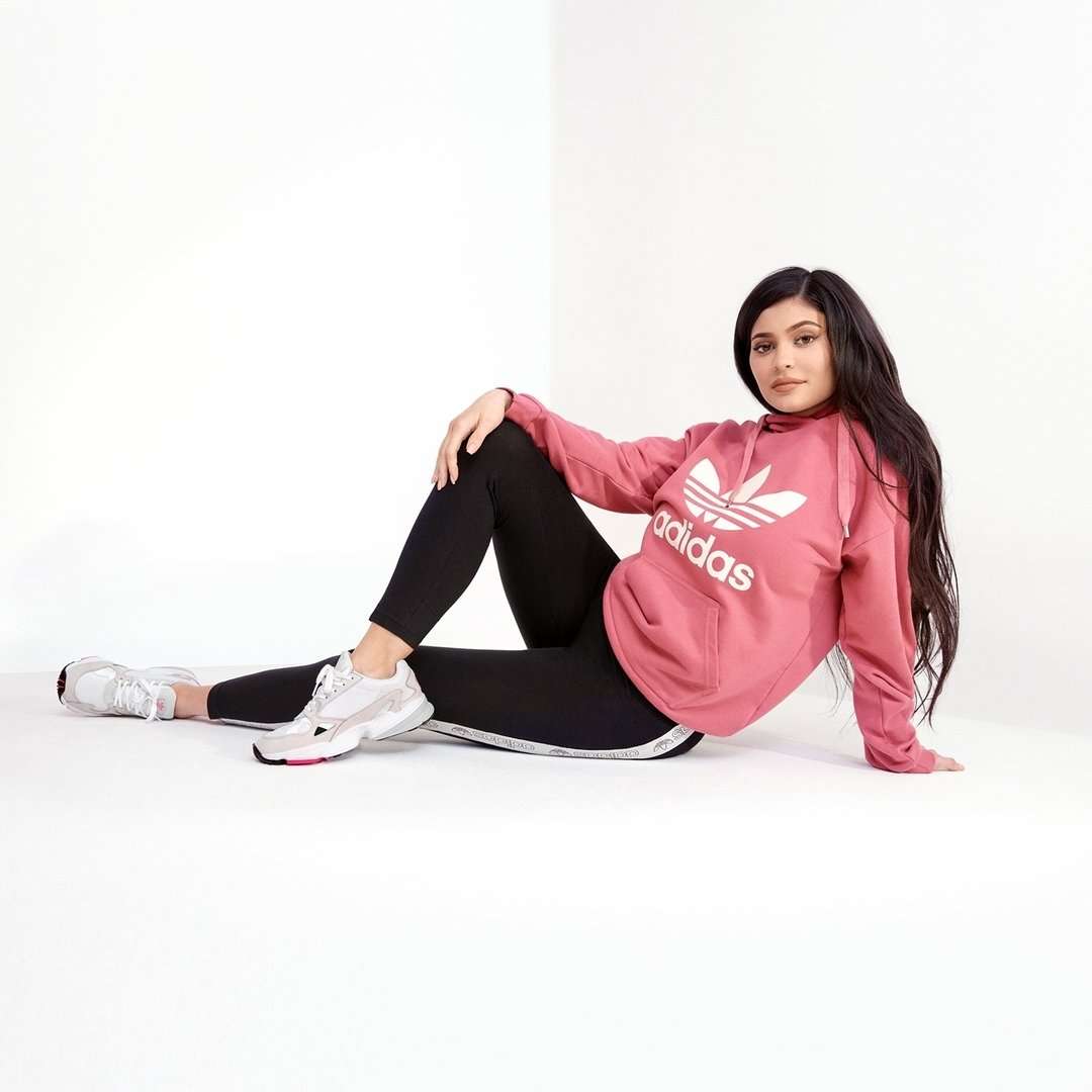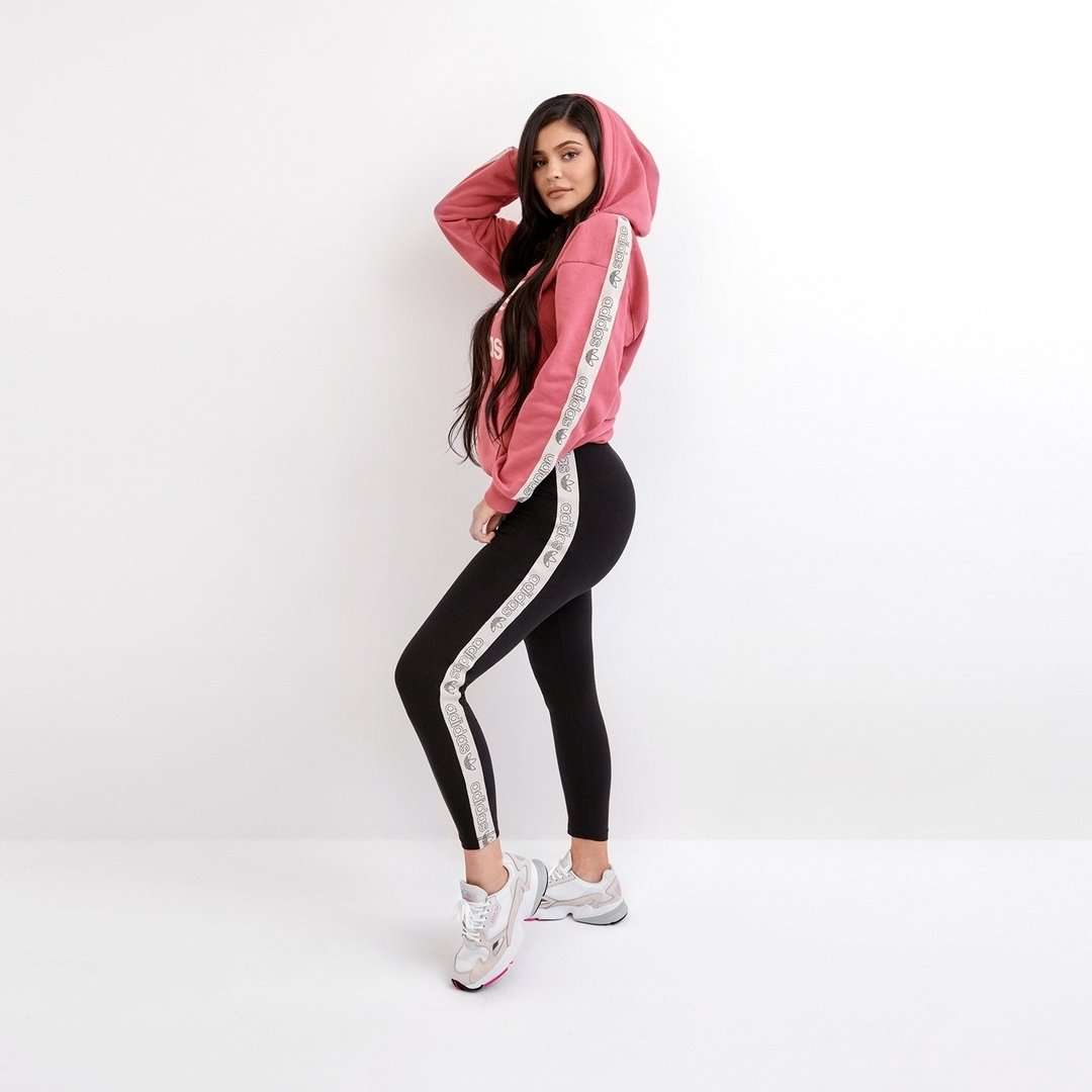 Kylie jenner pukee JD Exclusive -sneakerit pinkin adidas-hupparin kanssa.